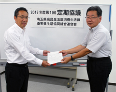 8月2日(木)15:00より、埼玉県生協連会議室にて、埼玉県と埼玉県生協連との第1回定期協議を開催し、埼玉県消費生活課より3人、埼玉県生協連より5人が出席し、2019年度埼玉県予算編成と行政執行に関する要望書をお渡ししました。