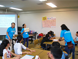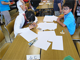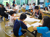 14時30分から、埼玉県ユニセフ協会による「貿易ゲーム」を子ども3チーム、おとな2チーム対抗で実施。与えられた資源を、思い思いの方法で活用しながら、財産を増やしていきました。