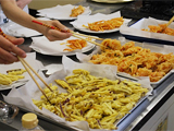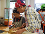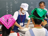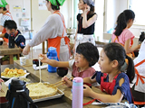次に、亀井さんが前日から寝かせておいてくださった生地を延ばして切る工程も体験しました。おそるおそる包丁を使う子も、徐々に慣れてきれいに均等に切るなど、みんな目を輝かせながら挑戦していました。松山婦人会のみなさんが揚げてくださったにんじんのてんぷらや玉ねぎのかきあげと一緒に、おいしくゆであがったうどんをみんなで試食しました。