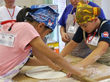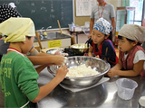 小川町伝統工芸館の亀井さん、高柳さんを講師に、うどんづくり体験がスタート。コープみらい西北ブロック委員会の4人のみなさんにもサポートいただき、子どもたちは3グループにわかれて、小麦粉と塩をまぜるところから、水を加えてこねるところも交代に体験しました。さらさらの粉が塩と水を加えただけで、つやつやの生地に変化する様子も目の当たりにしました。