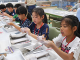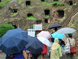 昼食後、吉見町埋蔵文化財センターに移動。小雨の中、吉見百穴や戦時中の工場跡、ヒカリゴケを見学し、ふたつめのものづくり体験「勾玉作り」を行いました。