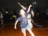 体験後、フレンドシップハイツよしみに戻り、夜の光のキャンプファイヤーに向けた歌の練習やブンブンゴマづくりなどをおこないました。夕食後の光のキャンプファイヤーは照明を消した体育館で、ボーイスカウト埼玉県連盟の木村さんを中心に、泉田さんのリードで歌や踊りをおこない、少し疲れたけど楽しい1時間を過ごしました。