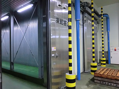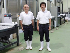 | 木村安之専務理事(右)と菅原正浩参事。「時代の変化に対応していくには消費者の方々との交流が大切で、それが個々の組合員の経営維持につながる」と話します。 | 凍結室をはじめ立体自動冷蔵施設、自動製氷施設など最新の設備が整っています。 |