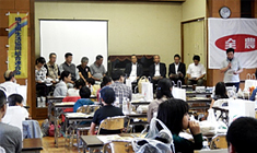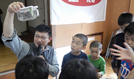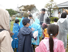 田んぼの生きもの調査の林講師より、実際に当日捕まえた虫を紹介いただき、田んぼやその周辺の生きものや自然環境、生態系などについてのお話をお聞きしました。途中、杉戸町の古谷町長とすぎぴょん(杉戸町マスコットキャラクター)も登場し、記念撮影する場面もありました。その後、お弁当や地域の杉戸町大島手作り味噌部会のみなさんが作ってくださった豚汁を食べながら、雨が小降りになるのを待ちました。