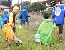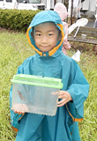 昼食後、若干小降りになった雨の中、隣接する草地に出て、生きもの調査をおこないました。子どもたちは虫かごや網をもって草地で生きものを探し始めましたが、雨で動きが鈍いこともあり、普段捕まえることが困難なクルマバッタやトノサマバッタを素手で次々に捕まえることができました。ほかにも、ショウリョウバッタ、オンブバッタ、クルマバッタ、コバネイナゴ、エンマコオロギ、ウスイロササキリ、ツユムシなど、多種多様な生きものを目にして、あちこちで歓声が上がっていました。捕まえた虫を林講師に見てもらい、正式な名前を教えてもらいました。身近にこんなにたくさんの虫がいることを知り、最後は、バッタとばしをおこない、生態系保護のため、捕まえた生きものを草地に戻して、終了しました。