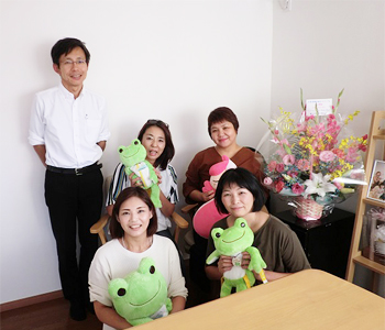| ▲石巻復興支援ネットワークやっぺす!の皆さん。 後列右端が代表の兼子佳恵(かねこよしえ)さん。 手に持っているカエルのぬいぐるみは、親子で防災を考える取り組みから生まれた「無事かえるリュック」です。 |