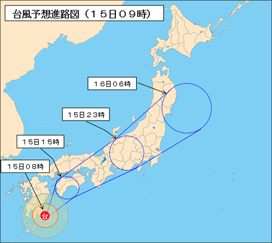 15日(火)5時熊谷気象台発表の天気予報は、埼玉県南部で夕方から暴風雨。
