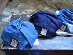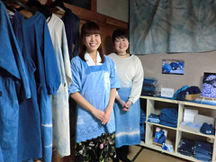 | ▲インディゴ気仙沼の工房の工房で、藤村さやかさん(左)とスタッフの遠藤千幸(ちゆき)さん。天然インディゴで染められたワークエプロンやストールなどの商品が展示されています。 | ▲天然インディゴ染めのストール。気仙沼の海をイメージさせる様々な青が魅力です。(写真提供:(株)インディゴ気仙沼) |