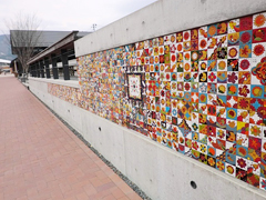 | ▲阿部鳴美(なるみ)さん(NPO法人みなとまちセラミカ工房代表)。「今後は腕の良い作り手がオリジナル作品で自分の工房を持てるようにしていくことも考えたい」と言います。 | ▲女川駅前の商業施設ハマテラスの壁面に貼られたメモリアルタイル。他の場所のタイルと合わせると全部で1300枚ぐらいあります。 |