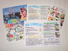 | ▲阿部民子さん。「たみこの海パック」のアイディアは震災前の14年間、自家製の海産物を友人、知人を通し電話やFAXで販売してきた経験から生まれました。 | ▲方言やレシピを載せた「たみこの四季だより」、養殖体験ツアー、ワークショップなどを通じて南三陸町を“伝えて”います。 |