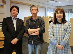 | ▲野蒜まちづくり協議会の皆さん。左から副会長の佐賀剛さん、会長の菅原節郎さん、副会長の山縣嘉恵さん。 | ▲震災後、高台に移設されたJR仙石線野蒜駅。広場のすぐ先に観光物産交流センターや市民センターがあります。 |
