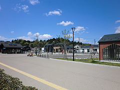 野蒜駅の改札を出ると、広場の向こうに野蒜ケ丘の新しい街並みが広がっています。