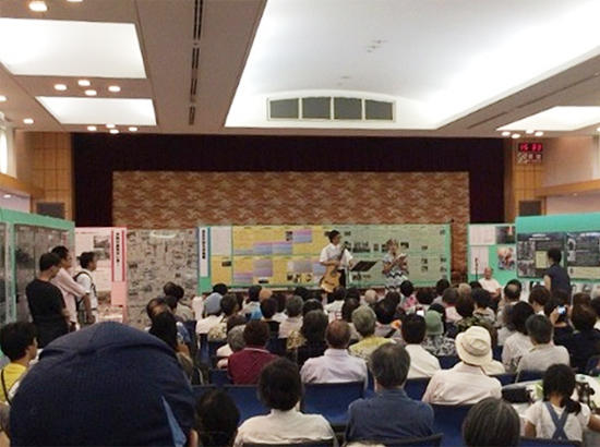 7月27日(土)、翌日に台風が接近するとの情報があり、10時30分の開場前にはすでに多くの方々が入場を待つ状況となりました。12時からのオープニングイベントに続き、13時からは「核兵器禁止条約実現を」と題して、しらさぎ会の方が被爆の実相を語りました。