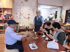 | ▲南三陸町社会福祉協議会結の里の皆さん。前列中央が髙橋吏佳(りか)さん。ウッドデッキは災害公営住宅の入居者がいつでも来られるようにとフラットで開放的なつくりになっています。 | ▲「えんがわカフェ」。8:30~17:00の間、2時間程度、ボランティアが関わります。7月からは、住民が自分の都合のいい日時と名前をカレンダーに書き込んで運営する方式になりました。 |