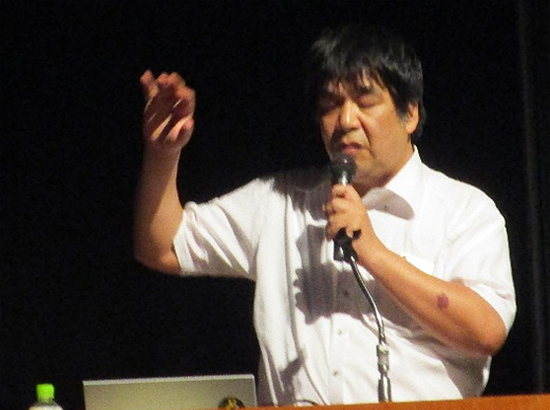 報告に続いて「忘れない、悲惨なフクシマ事故-目を覚まして、原子力を廃絶しよう」と題して、元京都大学原子炉実験所助教の小出裕章さんを講師に、講演いただきました。小出さんは、原子力は科学の最先端だと思われているが、実際は「古めかしい蒸気機関」だと指摘。原子力発電の様々な問題点についてお話しいただきました。また、東海第二原発の問題にも触れ、首都圏から150km圏内に位置し、半径30メートル圏内には94万人が生活しており、事故が起きれば首都圏が大規模な汚染を受けることなどを指摘されました。最後に「原子力の暴走を許したシニア世代が、意識的に原子力の息の根を止めなければならない」と締めくくりました。