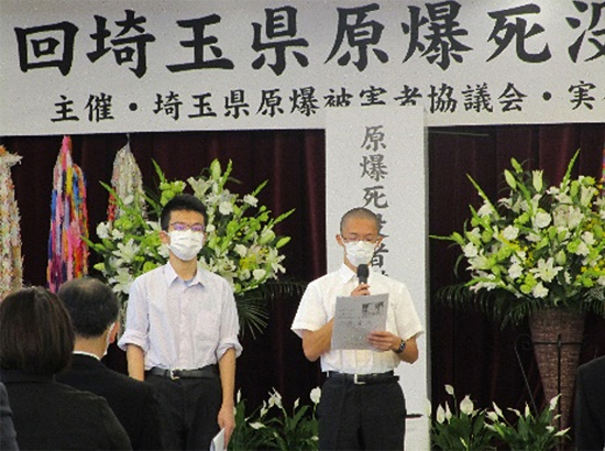 式典は、県内外からお寄せいただいた平和のメッセージの映像、埼玉合唱団が慰霊碑の前で合唱した「青い空は」の映像から始まり、「開会のことば」、埼玉県内の原爆死没者名簿の奉納へと進みました。2020年度に埼玉県内で亡くなられた方78人を含む1,758人のお名前が記載された名簿が奉納され、黙とうを捧げました。続いて行われた主催者慰霊のことばでは、しらさぎ会の原明憲会長が「核兵器禁止条約が発効したことは被爆者の核兵器廃絶の思いと行動、それを支えてくださった世界の皆様の力が結実したものです。核兵器のない社会に確実に一歩踏み出しました。核兵器の非人道性を引き続き訴え、核兵器のない世界の実現を目指します」と述べました。来賓のあいさつ、メッセージ紹介に続いておこなわれた浦和高校3年生の清水雅文さん、武田大輝さんによる平和の誓いでは「日本が平和であっても、世界のどこかで戦争や核兵器が使用されると言う悲劇が起きては本当の平和とは言い難いです。私たち若い世代が76年前に起きたことを胸に刻むことこそ、過去を繰り返さない第一歩となります」と誓いの言葉が述べられました。その後、聞き書き行動実行委員会が聞き書きした被爆の証言の朗読、献花・折り鶴奉納と進み、最後に平和の願い、核兵器廃絶の思いが、音楽に乗って世界に広がっていくことを祈りながら「原爆を許すまじ」を会場に流し、終了しました。