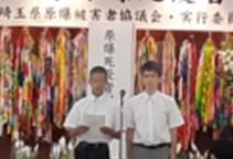 式典は、埼玉合唱団の「折り鶴」の合唱から始まり、「開会のことば」、埼玉県内の原爆死没者名簿の奉納へと進みました。2021年度に埼玉県内で亡くなられた方90人を含む1,893人の名簿が奉納され、黙とうを捧げました。続いて行われた主催者慰霊のことばでは、しらさぎ会の原明範会長が「先月21日には被爆者の思いが結実した核兵器禁止条約の第1回締約国会議が開催され、核兵器のない世界への私たちの約束と題するウィーン宣言、ウィーン行動計画が採択されました。これからも戦争の愚かさ、核兵器の残忍さ、非人道性を明らかにして、平和の尊さを訴える活動を継承していきます」と述べました。来賓のあいさつ、メッセージ紹介に続いて行われた県立熊谷高校の鈴木雄輝さん、井上晴太さんによる平和の誓いでは「核兵器と戦争に反対の声をあげること、そして自由に物が言える社会を守ることが私たちの使命です」と誓いの言葉が述べられました。