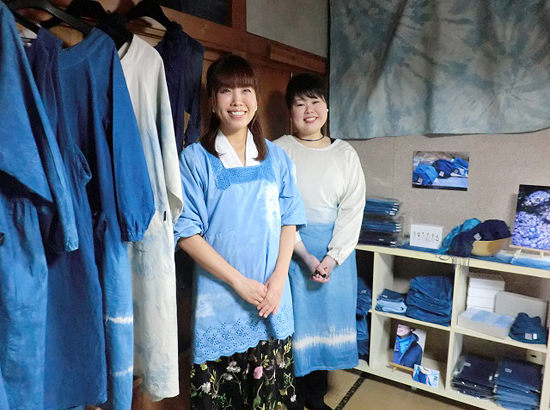 ▲インディゴ気仙沼の工房の工房で、藤村さやかさん(左)とスタッフの遠藤千幸(ちゆき)さん。天然インディゴで染められたワークエプロンやストールなどの商品が展示されています。