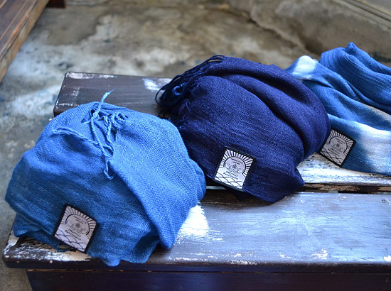 ▲天然インディゴ染めのストール。気仙沼の海をイメージさせる様々な青が魅力です。