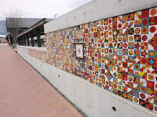 ▲女川駅前の商業施設ハマテラスの壁面に貼られたメモリアルタイル。他の場所のタイルと合わせると全部で1300枚ぐらいあります。