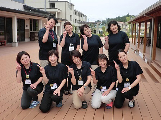 ▲南三陸町社会福祉協議会結の里の皆さん。前列中央が髙橋吏佳(りか)さん。ウッドデッキは災害公営住宅の入居者がいつでも来られるようにとフラットで開放的なつくりになっています。
