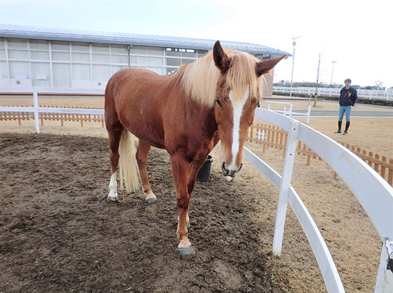 ▲クリーム色のたてがみを持つキャンディ(16歳・メス)はひき馬体験の人気者。津波で生き残った36頭のうちの1頭です。
