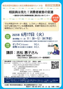 埼玉消費者被害をなくす会は、6月17日(火)11時30分より総会記念講演を開催します。