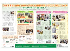埼玉県生協連は、「誰もが安心してくらし続けられる地域社会づくり」に積極的に取り組んでいます。この広告記事では、県内生協が地域の中でさまざまな団体と連携・協力して行っている居場所を紹介しています。医療生協さいたま生活協同組合の生協ケアホーム柿沼(熊谷市)の地域交流スペース「ココロン森のひろば」、生活クラブ生協が草加市でとりくむ居場所「花カフェ」などについて紹介しています。また、十文字学園女子大学副学長の星野敦子さんに、ご自身が取り組む居場所のご紹介と、生協の取り組みへの期待について寄稿いただきました。