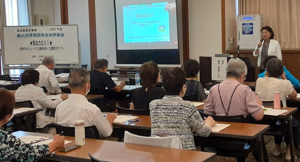 8月29日、さいたま共済会館およびオンラインで開催し、14団体66人(会場36人、オンライン30人)が参加しました。午前中は、「知は力なり!契約のキホンと最新のトラブル情報を知って消費者力アップ」と題して、消費生活相談員 鎌田伊津子さんを講師に学習し、午後は、12団体33人で6つのグループに分かれて、団体活動交流を行いました。