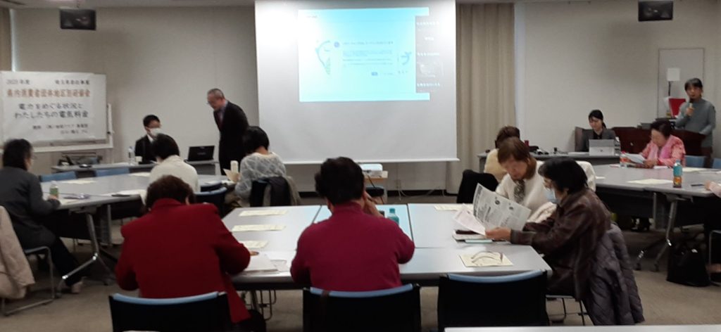 2024年1月26日(金)10時30分より、県内消費者団体地区別研修会③を、埼玉会館会議室およびオンラインで開催し、会場24人・オンライン14人計38人が参加しました。