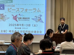 9月13日(土)、埼玉会館にて、埼玉県生協連ピースフォーラムを開催、5団体46人(うち小中学生6人)が参加し、沖縄・広島・長崎などでの平和行動の参加者や平和活動を推進する組合員などが、現地での体験を報告・共有し、現地で感じたことを忘れず、日々のくらしや活動の中で何ができるのかを話し合いました