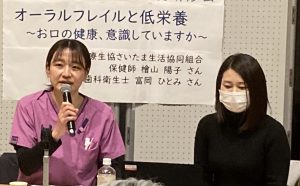 医療生協さいたまの保健師 檜山陽子さん、歯科衛生士 富岡ひとみさんを講師に、昨年開催した「高齢者と低栄養」の続編として、低栄養とお口の健康についてお話しいただきました。