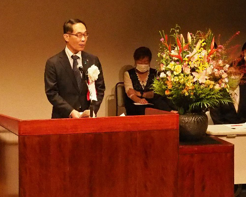 続いて来賓の大野元裕知事は、大会スローガンに触れながら、持続可能な消費社会の実現に向け、消費者も当事者であるとの自覚を持って行動すること、事業者・行政一体となって取り組みをすすめていくかなければならないと述べられました。立場が脆弱な若年層や高齢者の消費者被害が増加している中、消費者教育の充実や地域での見守り力向上に努めていきたい、消費者被害根絶のため、消費者団体への協力を呼びかけられました。