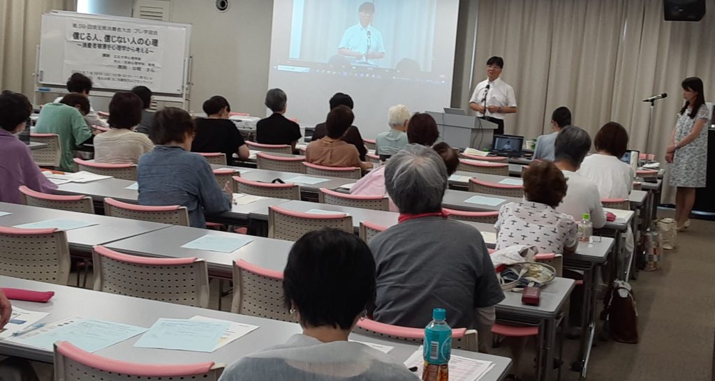 今年の第59回埼玉県消費者大会は、県内22の消費者団体が3月から実行委員会を開催し、10月25日の大会開催に向けて、社会状況や消費者課題について学びながら、話し合いをすすめています。プレ学習会では、詐欺・悪徳商法やマインドコントロールについての研究で著名な西田公昭さんに、消費者被害防止について、心理学の視点からお話しいただくこととしました。