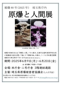 6月9日(月)~20日(金)まで、埼玉県庁にて、埼玉県原爆被害者協議会(しらさぎ会)が主催するパネル展「原爆と人間展」が開催されています。被爆の実相を伝える「原爆と人間」パネル・広島市立基町高等学校生徒が被爆者の証言を聞いて描いた「原爆の絵」の展示、ノーベル平和賞受賞関連展示などを行っています。