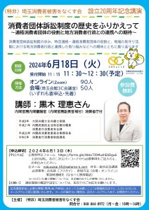 埼玉消費者被害をなくす会は、6月18日(火)11時30分より総会記念講演を開催します。 設立20周年記念講演として、消費者団体訴訟制度の歩みや特定適格・適格消費者団体に期待することなどを、消費者庁付 内閣官房内閣審議官の黒木 理恵さんにお話しいただきます。