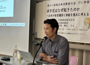 9月12日(金)、第61回埼玉県消費者大会プレ学習会「米不足はなぜ起きたのか ~お米の安定確保と供給を視点に考える~」を開催し、会場52人、Zoom56人、計108人が参加しました。講師は、一昨年の第59回埼玉県消費者大会食の分科会でもお話しいただいた、加須市を拠点に大規模農業に取り組む生産者、中森農産株式会社代表取締役の中森剛志さんに、米、農業、エネルギーなど幅広い視点で講演いただきました。