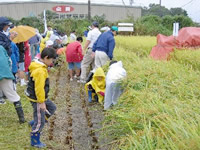 会場から歩いて10分ほどの「体験圃場」で、危険のないよう鎌の使い方の説明をうけた後、4班に分かれて稲刈りを開始しました。色とりどりの合羽を着て親子一緒に始めた刈り取りも、次第に手つきも慣れ調子が出たところで雨のため早々の切り上げとなってしまい、子どもたちは少し残念そうでした。