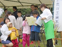 県産米のコシヒカリのおにぎりとキュウリの漬物、そして県産野菜がたくさん入った「すいとん」の試食を行いました。その後、5月の田植え時に持ち帰ったバケツ稲の簡単にできる脱穀方法と籾殻とりの説明が行われ、続いて、子どもたちからバケツ稲の成長の紙芝居と体験稲刈りの感想の発表がありました。