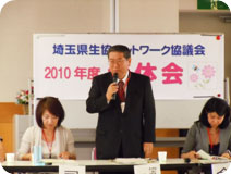 1.埼玉県生協連の伊藤恭一会長理事より、2010年度の体制について、5月19日の県生協連理事会で滝澤玲子さんが引き続き会長に推薦されたことが報告されました。また、「私たちは消費者市民社会を目指し、誰もが安心して消費できる社会、公平で健全な社会にするために、私たち自身が運動し活動していくことが大切です。ネットワーク協議会は、年々委員も増えています。皆さんが学習・交流して輪を広げ、ますます活発に活動をしてください。この活動が埼玉県の生協の力になっていきます。」とあいさつされました。 2.埼玉県生協ネットワーク協議会の会長に滝澤玲子さんが拍手で確認され、挨拶がありました。 4.協議会メンバーの自己紹介を行いました。