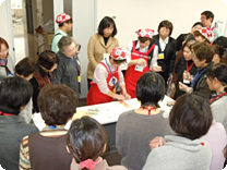 2012年7月に新装オープンした、直売所の概要をお聞きした後、店内へ。新鮮な果物・花・野菜が並び、加工品生産所(団子)がありました。農産品・加工品を見て質問・交流しました。試食もいただき、あらためて県産農産品を知るよいきっかけになりました。 3.飾り巻き寿司作り 見川会長が講師となり、花寿司(バラ)作りに挑戦しました。さいたま市産のコシヒカリ、桜でんぶ、薄焼き卵、野沢菜、のりで一人一人巻いていきました。 4.昼食 出来上がった巻き寿司に、地場産のサトイモ、ニンジンなど入ったけんちん汁とくわいの素揚げを頂きながら、JAと生協ネットワークから商品の紹介をしました。 5.JA女性協議会の取り組み紹介 会員数の推移、活動の4つの大きな柱(食と農に関する活動、文化活動、エコライフ活動、助け合い活動)について紹介されました。 6.生協ネットワーク協議会の活動報告 生協ネットワーク協議会と、参加している6つの生協の活動を紹介しました。 7.意見交換 感想や料理の話、団体での取り組みについて、班で交流しました。 【参加者のアンケートより】