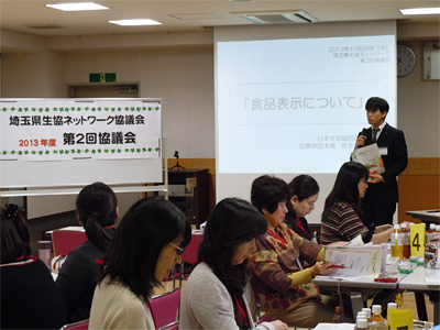 1.新しい食品表示法についての学習会を行うにあたって、生協ネットワーク協議会 滝澤玲子会長より「新「食品表示法」の今後が議論されています。表示について様々な学習をされていると思いますが、あらためてこれまでをお聞きし今後の取組に生かしていきましょう。」と挨拶がありました。 2.学習会 「食品表示法について」 日本生協連安全政策推進室の井之上 仁さんを講師に、食品表示法についてお話しいただきました。井之上さんは、食品表示の現在とこれまでの経緯、新食品表示制度のこれからについて、現在議論されていること、日本生協連の取り組みを紹介され、事前に寄せられた質問への回答を含めて説明いただきました。まとめとして「表示は、食の安全の信頼、消費者が食品を選択するためにあるものです。今後の制度のなかで表示方法の指針など難しい内容ですが、意見をだしていくためには正しい食に対する知識も大切で情報の理解につながります。」とお話しをいただきました。参考としてコープこうべの自社工場の取組もご紹介いただきました。 〔質疑応答〕 Q:トランス脂肪酸の表示はどうなりますか? A:トランス脂肪酸を含め、何を表示するのかこれから議論されることになります。 Q:納豆で「国産大豆使用」の表示は何%の国産大豆使用でそう表示できますか? A:特色のあることを示す用語で他との差別化を図るものについては使用100%である場合に限り表示できます。 3.各生協の活動交流 運営委員より、コープみらい、パルシステム埼玉、医療生協さいたま、さいたま住宅生協、勤労者生協の活動紹介を行い、福島の情報として福島土壌くらぶについて等の報告と、各テーブルで交流を行いました。 おすすめ商品の紹介は、産直たまごのスープ、ツナ缶、フェアトレードコーヒー、クッキー、チョコレートがありました。 4.報 告 10月10日に開催された第49回埼玉県消費者大会の報告を行いました。当日、「食」の分科会を生協ネットワーク協議会が担当しました。 【感 想】