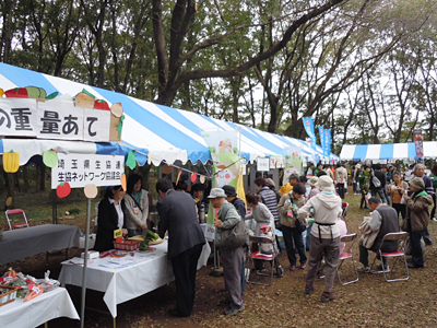 彩の国 食と農林業ドリームフェスタは、県民の日(11月14日)の記念事業として開催されているもので、埼玉県の農業・農山村の素晴らしさや、県産農産物のおいしさを味わえる県内最大の農林祭です。今年の会場となった東松山市の岩鼻運動公園には、二日間で7万人を超える来場者が訪れ、埼玉の農産物のおいしさを満喫しました。 埼玉県生協連は、県内の4生協と一緒に出展し、生協ネットワーク協議会でおこなった「野菜の重量あて」や、それぞれ趣向を凝らした各生協のブースに、多くのご参加をいただきました。 2013彩の国 食と農林業ドリームフェスタ