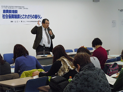 県内各地で生協組合員の活動のネットワークを広げていこうと、共に学び合い、組合員同士の交流をすすめている埼玉県生協ネットワーク協議会は2月18日、浦和コミュニティセンターで公開学習会を開催しました。中央社会保障推進協議会事務局長の山口一秀さんを講師に、消費税と社会保障制度について71人が参加して学習しました。