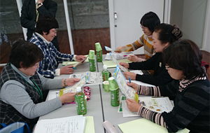 生協ネットワーク協議会 「さいたまの生協」を使い、協議会の内容について説明されました。あわせて、協議会に参加している各生協からそれぞれ活動紹介されました。 ―テーブル交流― 参加者が7つのテーブルにわかれ、日ごろの活動や地産地消について、生産者と消費者の立場を超えて話し合い、交流を深めました。昼食交流の時間には、米粉に関する簡単な学習、第3回協議会で審査をおこなった「米消費拡大レシピ」の結果発表とレシピが紹介されました。