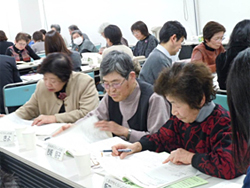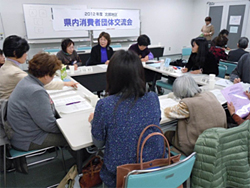 (1)学習テーマと各団体の創設をふりかえって(2)平成24年度埼玉県市町村における消費生活関連事業調査から読み取る、わが町の様子について、4つのグループで話し合い、交流しました。