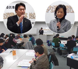 その後、猪原さんから、寸劇事例の解説と、インターネット取引被害の現状、それに対する民法と消費者保護法による解決策を中心にお話をいただきました。被害を防ぐために大切なこととして「行政だけでなく地域ネットワークによる活動の広がりが大切です」と参加者に向かって呼びかけました。 2.事例報告『消費生活相談員から聞く「消費者被害」最新情報』
