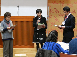 2.事例報告『消費生活相談員から聞く「消費者被害」最新情報』 埼玉県消費生活コンサルタントの会の倉田るみ子さんを講師に、消費者被害の最新事例を学びました。最初に被害を防ぐために私たちができることとして「地域の皆さんの見守りで高齢者の変化を掴むこと(被害にあっても自分から相談しないことが多い)」「自分は被害にあわないと過信しないこと」と参加者に呼びかけました。その後、倉田さんが実際に見聞きした被害事例を中心にお話いただきました。 3.交流会・2015年度消費生活関連事業調査結果報告 休憩をはさんでおこなわれた交流会では、4グループに分かれて、学習会・事例報告を受けての意見交換、日常の活動に関する交流を行いました。テーブル報告では「今後の活動についての意見交換ができ、次年度の活動につなげていける良い機会となりました」「事例報告が大変参考になった。啓発につなげていきたい」などの発言がありました。その後、埼玉消団連の岩岡さんから、2015年度消費生活関連事業調査結果について報告がありました。 |