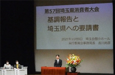 11月9日(火)、「自ら考え行動する消費者になろう~誰ひとり取り残さない持続可能な社会を目指して~」を大会スローガンに、第57回埼玉県消費者大会が開催されました。 開会に際し、実行委員会を代表して高田美恵子実行委員長のあいさつがあり、実行委員会で話し合いを積み重ね、実参加とオンライン参加で全体会と午後の二つの分科会を開催することになり、努力と工夫を積み重ねて、新しい形の大会を開催することができたことを報告しました。 次に、実行委員会で論議を重ねて確認した「基調報告」のポイントと「埼玉県への要請書」の主要な内容について吉川尚彦事務局長から説明しました。 続いて来賓の大野元裕知事より、高齢者・単身世帯の増加や成年年齢引き下げなど、社会の変化の中で、埼玉県でも消費生活相談が5万件を超えるなど消費者被害が増加している中、悪質事業者は決して許さないとの姿勢で、消費者被害防止サポーターの育成や消費者安全確保地域協議会の設置をすすめ、高齢者への声かけなど見守り力向上と未成年者への心くばりなどへの協力を呼びかけられました。